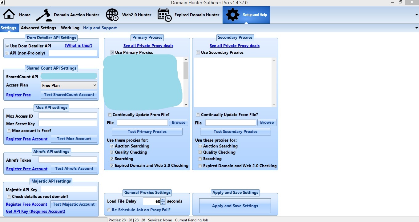 Ora, quando si tratta di proxy, Domain Hunter Gatherer, proprio come il 99% di tutti gli altri strumenti di marketing online, dipende fortemente dai proxy per ottenere risultati migliori e più veloci. Una manciata di proxy privati di BuyProxies o un gruppo di proxy appena controllati di GSA Proxy Scraper farà il possibile. Ma, hai bisogno di alcuni proxy e questo è sicuro. Incollo sempre il mio nella sezione “Primary Proxies” , perché non ho mai avuto bisogno di “Secondary Proxies” . Quelli che uso funzionano bene. Per quanto riguarda le impostazioni sotto i proxy: